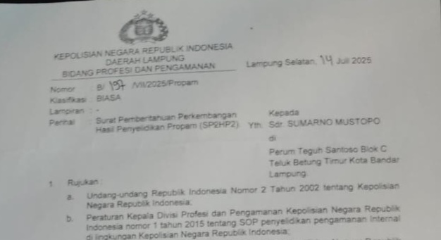 Hal itu tertuang dalam Surat Nomor B/197/VII/2025/ Propam prihal Surat Pemberitahuan Perkembangan Hasil Penyelidikan Propam ( SP2HP2) tanggal 14 Juli 2025 ditandatangani oleh An. Kabid Propam Polda Lampung Kasubbid Paminal AKBP Andhiek Budi Kurniawan .S.I.K.