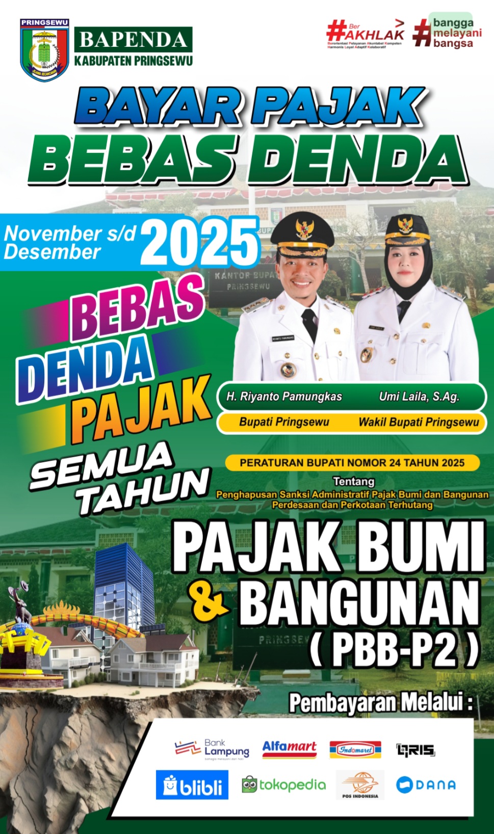Program ini memberikan kesempatan kepada wajib pajak untuk membayar Pajak Bumi dan Bangunan Perdesaan dan Perkotaan (PBB-P2) tanpa dikenakan sanksi denda keterlambatan. Kebijakan tersebut tertuang dalam Peraturan Bupati Pringsewu Nomor 24 Tahun 2025 tentang Penghapusan Sanksi Administratif PBB-P2.