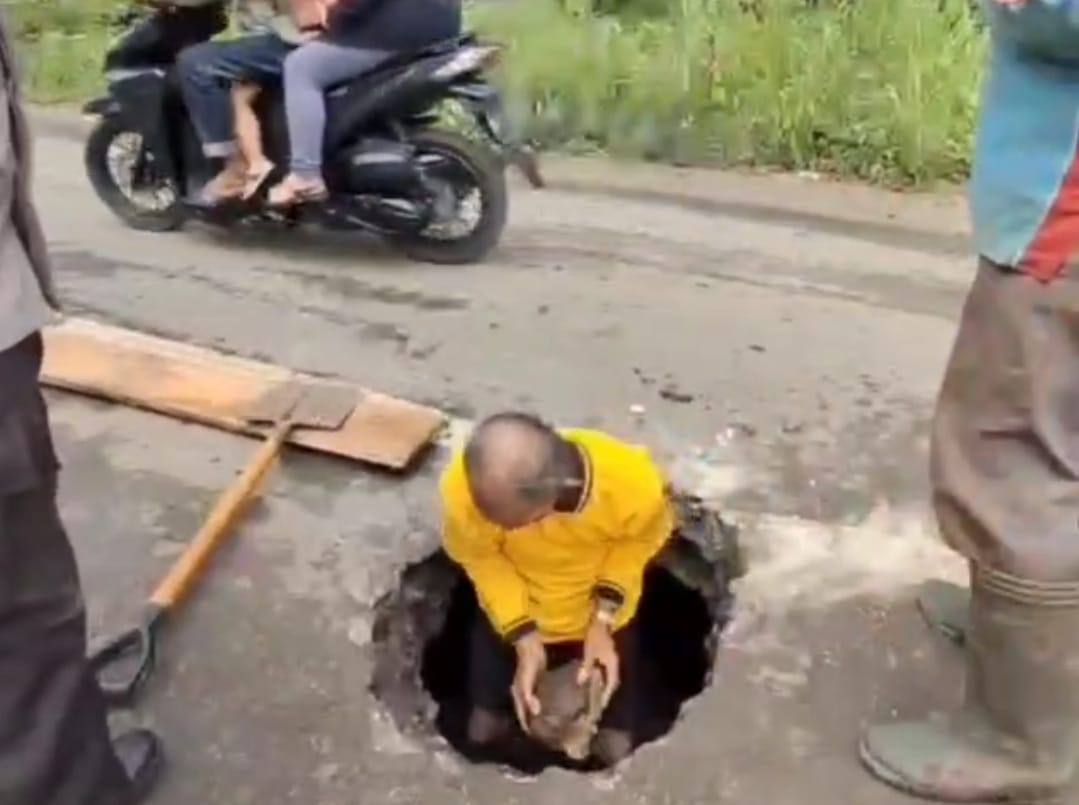 Hujan deras yang mengguyur sejak dini hari memperburuk kondisi gorong-gorong. Struktur yang sudah rapuh itu kini ambrol, meninggalkan lubang besar yang menganga di badan jalan.