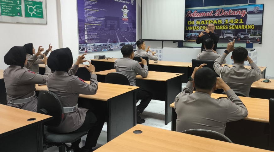 SEMARANG-Sebagai wujud komitmen dalam memberikan pelayanan yang ramah kepada seluruh lapisan masyarakat, Unit Regident Satlantas Polrestabes Semarang yang membawahi pelayanan BPKB, STNK, dan SIM, menggelar pelatihan bahasa isyarat bagi para personel.